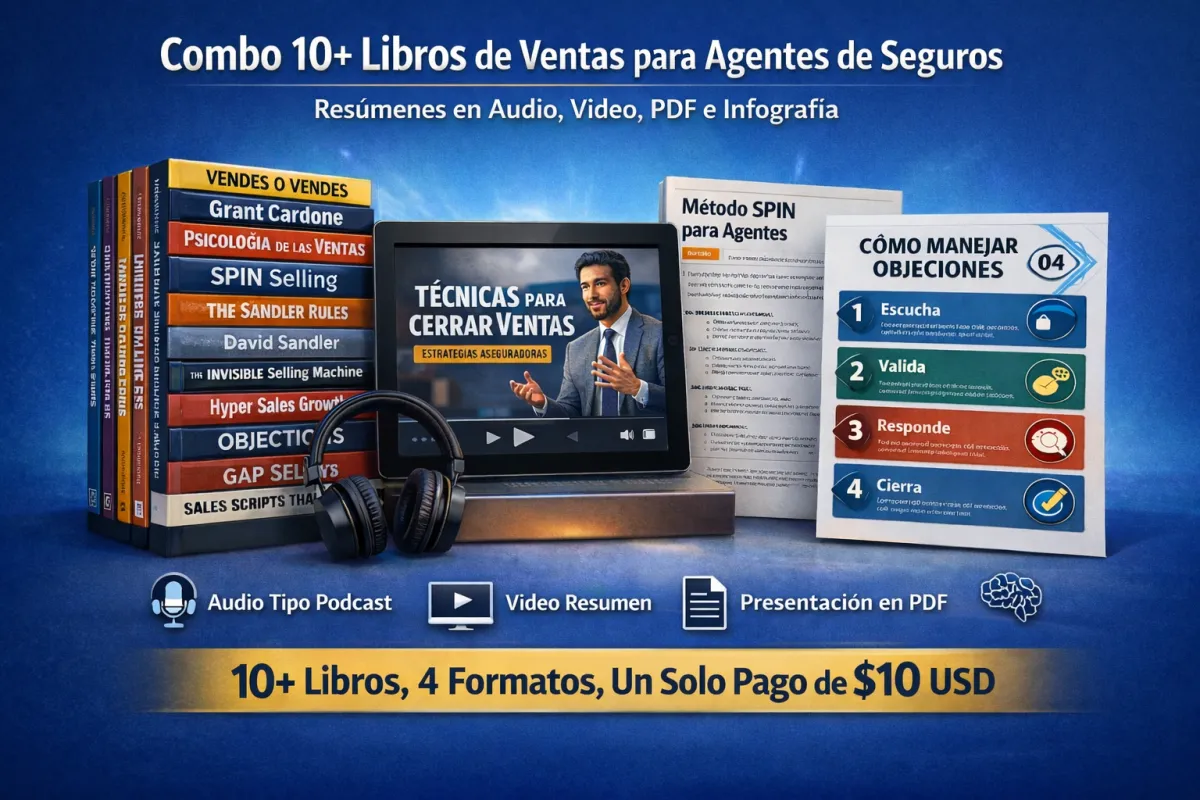 Un combo de resúmenes estratégicos de los mejores libros de ventas, aterrizados al día a día del agente de seguros.